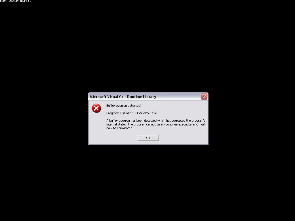 Posiadam grę Call Of Duty w wydaniu "Best Of Activision" Deluxe. Po instalacji nie uruchamia się tylko wyświetlany jest komunikat "Buffer overrun detected". Wie ktoś o co chodzi i co z tym zrobić? Nie mam zainstalowanych żadnych programów do kopiowania płyt typu Alcohol czy ClonyCD. Wiem że takie programy powodują problemy z uruchamianiem gier. Taki komunikat pojawia się też niezależnie od tego czy zainstalowane są biblioteki Visual C++ czy też nie.A z tytułu okienka wynikałoby że to problem tych bibliotek. Wysiadam przy tym. I to nie pierwsza gra wydania "Best Of Activision" która nie działa.