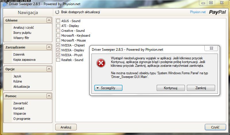 Odinstalowałem, uruchomiłem ponownie komputer, uruchomiłem Driver Sweepera i wyskoczył błąd!