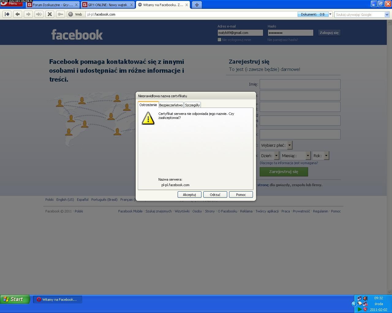 masz dziwny adres tego facebooka, nie dziwię się, że Ci wywala problemy antivir i certyfikat, a do tego nie działa autologowanie.