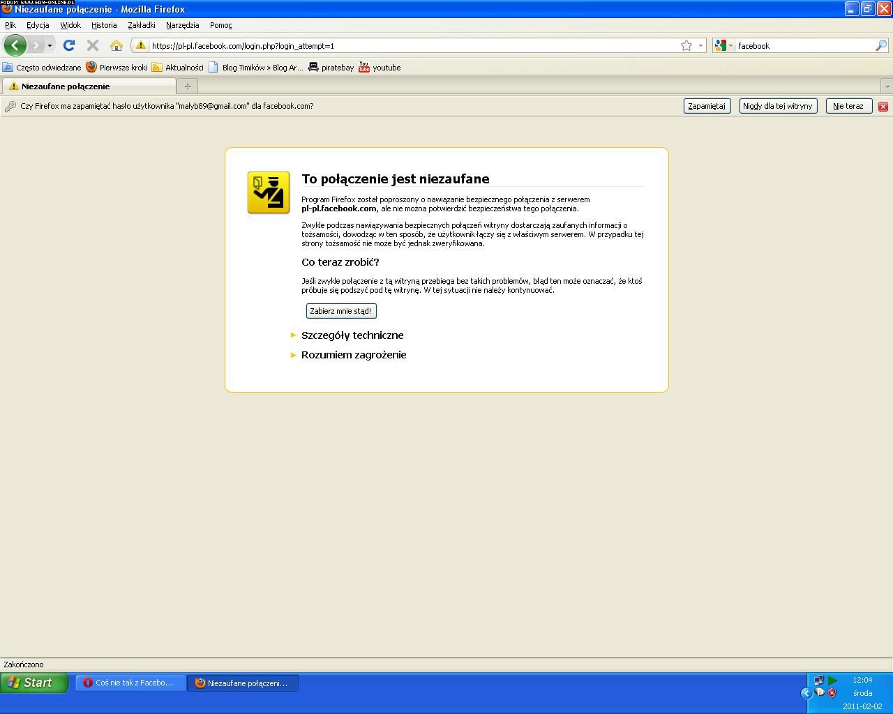 Próbowałem też zalogować się na innym kompie na FF i wyskoczył komunikat, że instnieje niebezpieczeństwo i że ktośmoże podszywaćsię pod tą stronę.