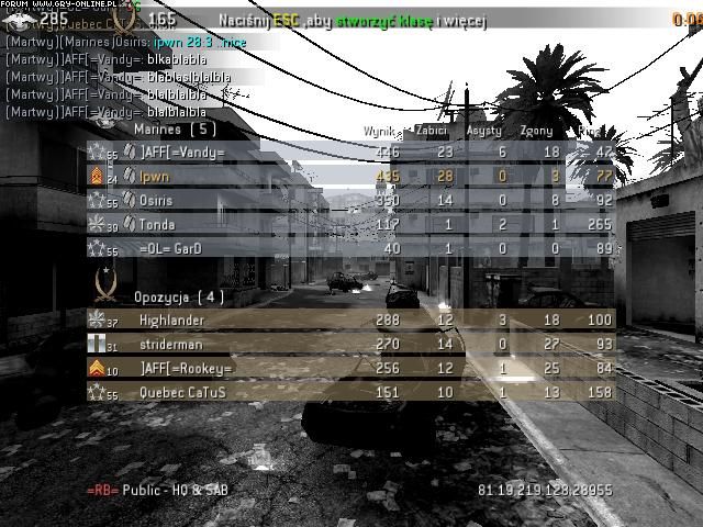 Hahahha... No nie moge... Pierwszy server - mapa, w sumie nie wymiatalem jakos, ale bylem pierwszy - ban na servie (Jakis New York na 32 osoby). Dobra. Wchodze na drugi TDM tez jakis duzy New York, zwykly TDM bez HC 32 osoby. Gram. 4 mapy z rzedu powyzej 700 punktow (70 zabic), a inni po 200 pkt. Na piatej mapie dostaje bana. Co za lamerska scena.