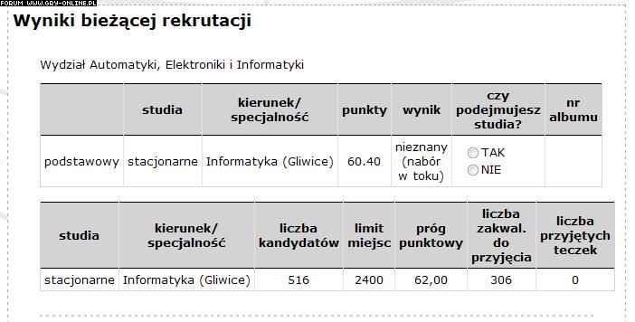 @ [414] Już chyba czaję, dostałem się a te 456 to jest numer kandydata czy coś takiego, więc nie liczy się kolejność. Ogólnie to chyba zostałem studentem, ale jestem nie w stanie więc mam nadzieję, że jutro się nie zdziwię :p