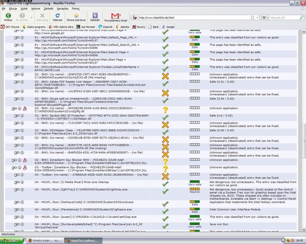 Próbowałem go traktować różnymi programami : Avastem, Antirootkitem,skanerami online,Spybotem S&D oraz hijackiem - wklejam raport.