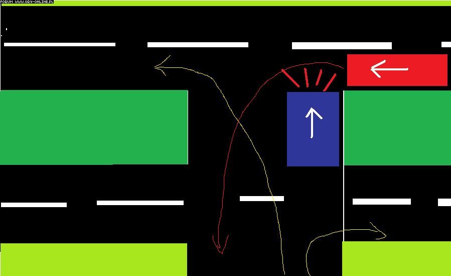 Przedstawie was sytuacje jaka mnie spotkala wczoraj podczas powrotu do domciu. Otoz jechalem sobie czerwonym autkiem jak na obrazku i chcialem sobie skrecic tak jak na rysunku wskazuje strzalka czerwona , ale nagle wylonil mi sie jakis pedant (niebieski klocek), ktory niedosc , ze wedlug mnie zle jechal, to jeszcze na mnie mial czelnosc zatrabic ze zwolnilem , bo niewiedzialem co on zamierza zrobic , gdyz kazde auto jak chce skrecic w prawo wyjezdzajac z tej drozki i wbijajac sie na trase odrazu tnie w prawo a ci co chcia w lewo to pochylaja sie bardziej na lewa strone i cisna sobie tak jak pokazuje strzalka zolta. A co wy o tym sadzicie ? Bo mnie ten koles zaskoczyl a to , ze zatrabil to mnie totlanie podku***lo. Co robic w takiej sytuacji? Trabic ? Zbesztac pajaca? A moze to ja zle postapilem zwalniajac ? ( Droga ta jest droga szybkiego ruchu i ja mam pierwszenstwo )
