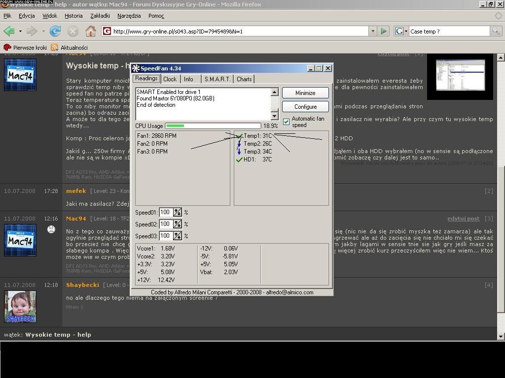 Stary komputer moich dziadków zaczął się zacinać i później już tylko restart pomagał więc zainstalowałem everesta żeby sprawdzić temp niby wszystko w normie tylko że nie pokazuje grafiki i jednego HDD... No ale dla pewności zainstalowałem speed fan no patrze pisze temp1 = 90stopni !