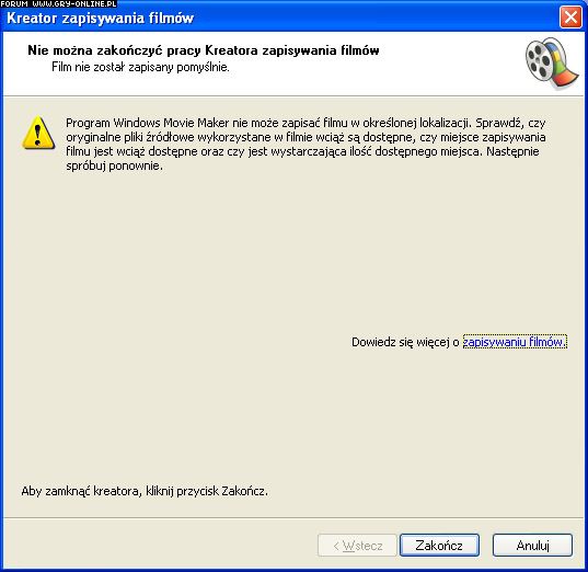 Witam all! Chcialbym polaczyc obrazek z muzyka i do tego celu wykorzystalem Windows Movie Maker. Wszystko ladnie pieknie do czasu gdy przychodzi czas na zapisanie filmu. Wtedy podczas zapisywania wyswietla mi taki komunikat -->