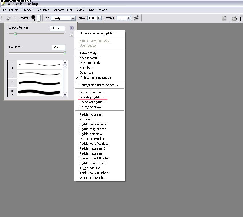kiedy masz kliknięte "brushes" i menu z rozwijaniem brushy na górze, to po prawej, obok brushy, masz taką trójkątną strzałkę --->klikasz na nią, rozwijasz menu i "wczytaj pędzle", potem wybierasz plik brushy i dodają się do listy.