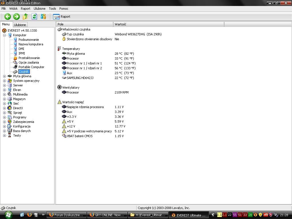 Dzisiaj rano wyslalem swoj ram na gwarancje, poniewaz jedna z kosci byla uszkodzona. Na czas wymiany pożyczyłem od znajomego 2x 512 667 mhz (bodajze Hyperion). Przed wymiana bylo wszystko ok, a teraz nagle grafa zaczela mi sie strasznie grzac (fan fix rozwiazuje ten problem, ale teraz grzeje mi sie nawet w windzie) oprocz tego wszystkie temperatury sa w normie (chociaz procesor tez ma chyba lekko wyzsza temperature niz zwykle wrzucam screen z everesta), a komputer sie zawiesza zapetlajac przy tym dzwiek. Zawiesza sie zarowno w windzie (mam wrazenie, jakby sie wieszal tylko przy puszczonej muzyce) oraz w grach (patrzylem tylko na Spore - wiesza sie gora po 5 minutach). Ramy sa raczej dobre, u znajomego wszystko dzialalo, u mnie zapuszczony na godzinie memtest nie pokazal zadnych bledow. Co moze byc przyczyna zawiasow? Mam nadzieje, ze to nic sprzetowego, bo jak juz pisalem dzisiaj wyslalem ramy na gwarancje, a komp kupiony tydzien temu ;).