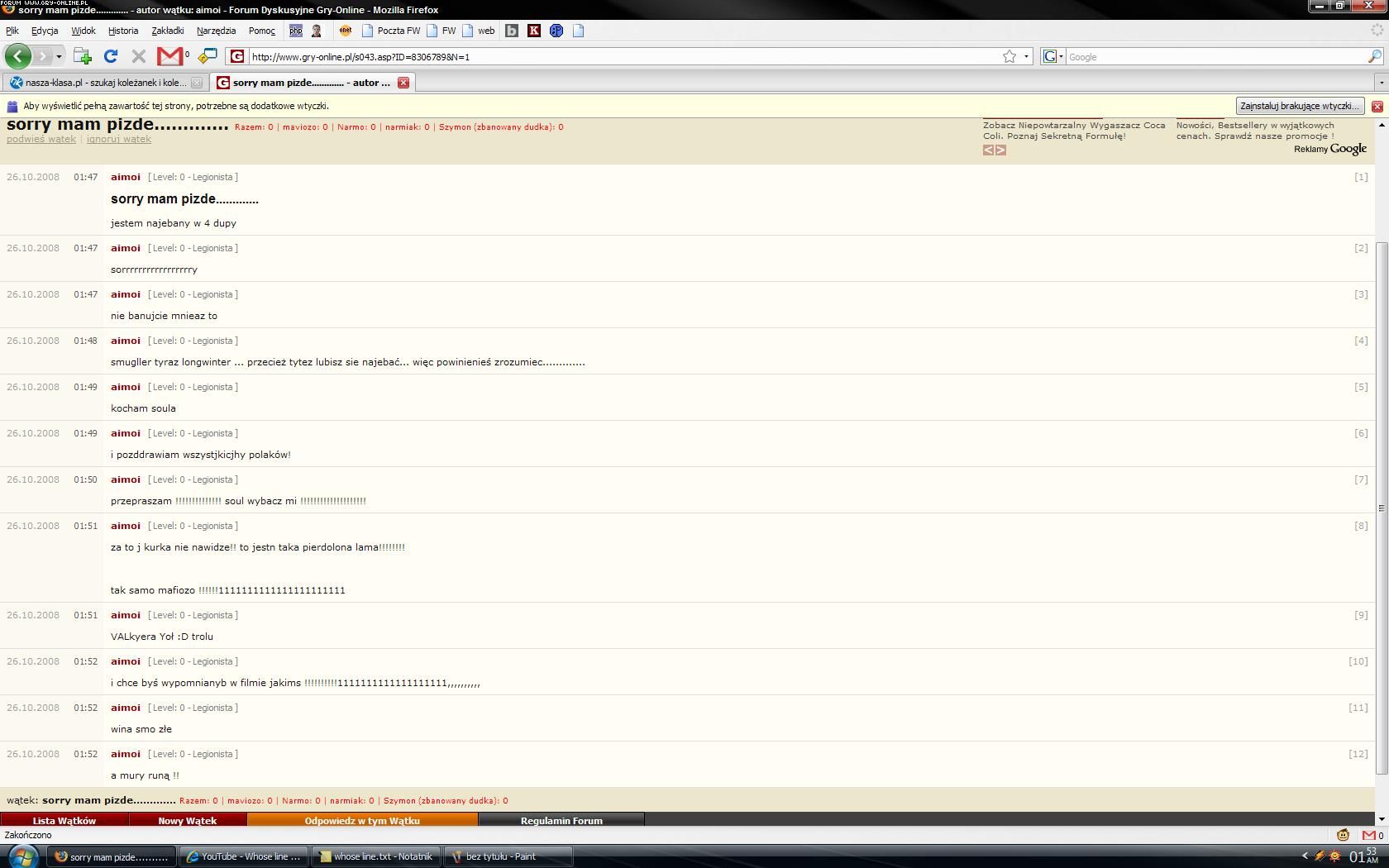Kozi->właśnie to mnie w specyfice gola boli najbardziej. Wątki o urodzinach to każden jeden chce zakładać, a o głupią ocenę piosenek które wrzuciłem musiałem się prosić w sumie cztery razy..to samo jest w wątkach które zakładam - niby są, ale zainteresowanie średnio-kiepskie.