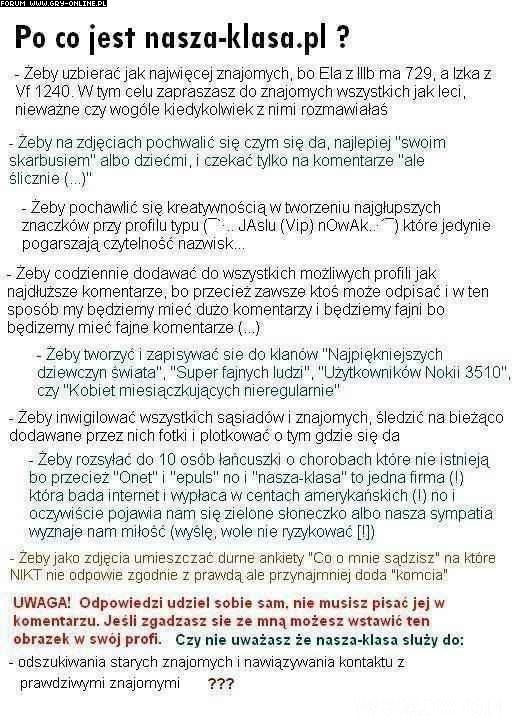 nasza klasa to dno , nie mogę patrzeć na ludzi którzy maja po 700 znajomych i dodają ludzi tylko zęby mieć więcej od innych a potem chwalą się jacy to oni nie są fajny osobiście nie używam naszej klasy chociaż mam założone tam konto .