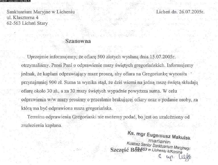 nie rozumiecie: Ksiadz napisał w liście: "Prosi Pani o odprawienie mszy świętych gregoriańskich." Książ dalej pisze "dziś wierni na jedną mszę świętą składają ofiarę okolo 30 zl"