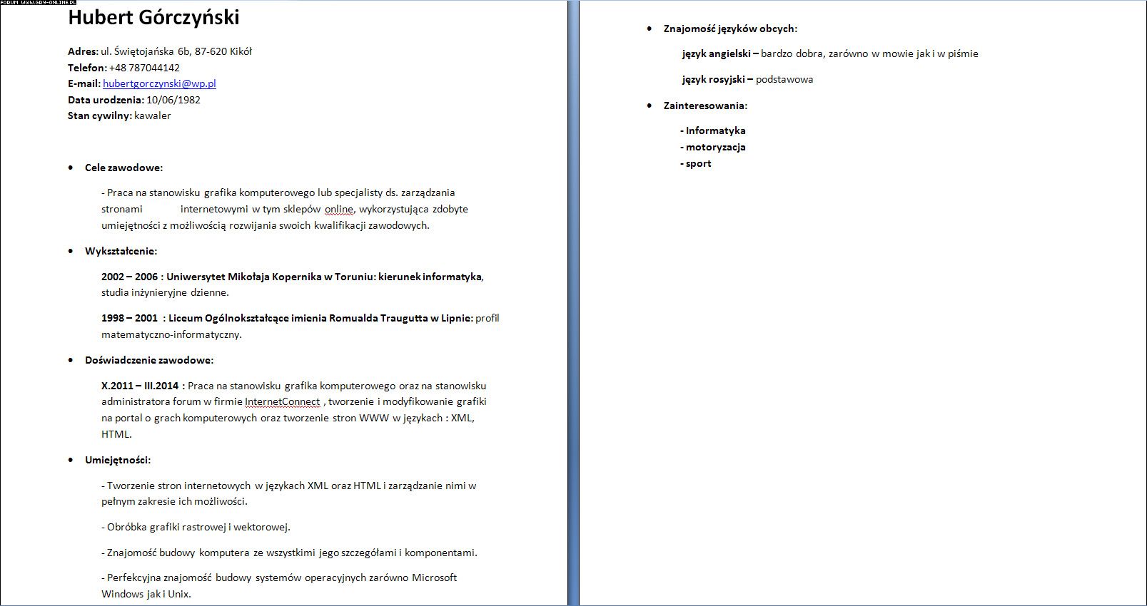 i ogólnie jest mało przejrzyście - jakbyś w notatniku robił to CV :P popracuj nad formą - ściągnij sobie jakiś przykład z neta :) będziesz miał jakiś pogląd i będzie to wyglądać nieco poważniej :)