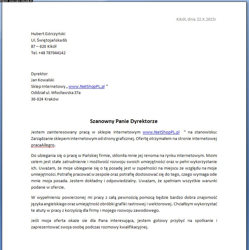 Lysack -> Pierwszy list motywacyjny i CV jakie napisałem :) Chodzi oto by się nauczyć pisać takie rzeczy i właśnie to czynię dzięki Wam:) Wciąż poprawiam dalsze błędy ;)