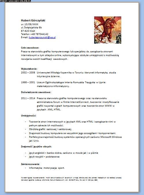 aha, i jeszcze do CV - formułka "wyrażam zgodę na przetwarzanie.. tralalalala"