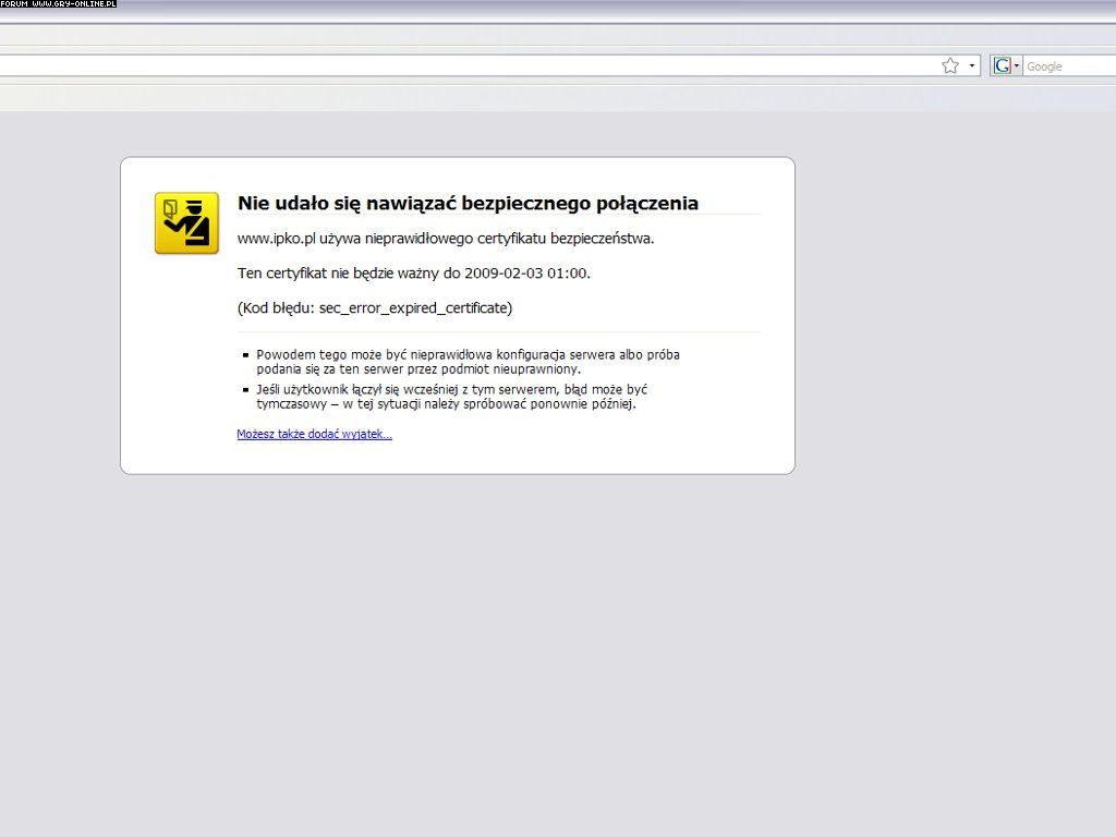 Mam problem z certyfikatem SSL w banku PKO i innych ( przeglądarka FireFox i IE8 ), otwarcie strony do logowania powoduje wyświetlenie komunikatu ( zdjęcie ). Problem jest widoczny od trzech dni.