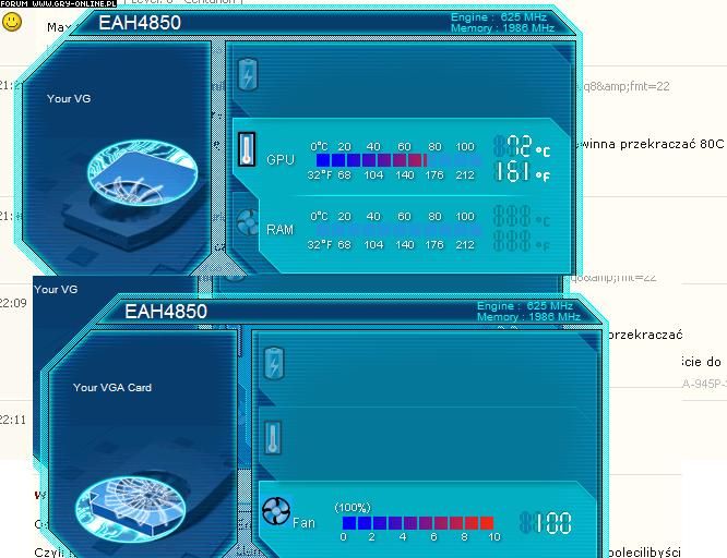 Ja mam Gigabyte HD4850 i ma w stresie ok. 80, a wiatrak chodzi nie więcej niż na 25%. Jak ręcznie ustawie na 70% temperatura spada sporo, ale szumi jakbym odkurzacz włączył... Trochę to irytuje...