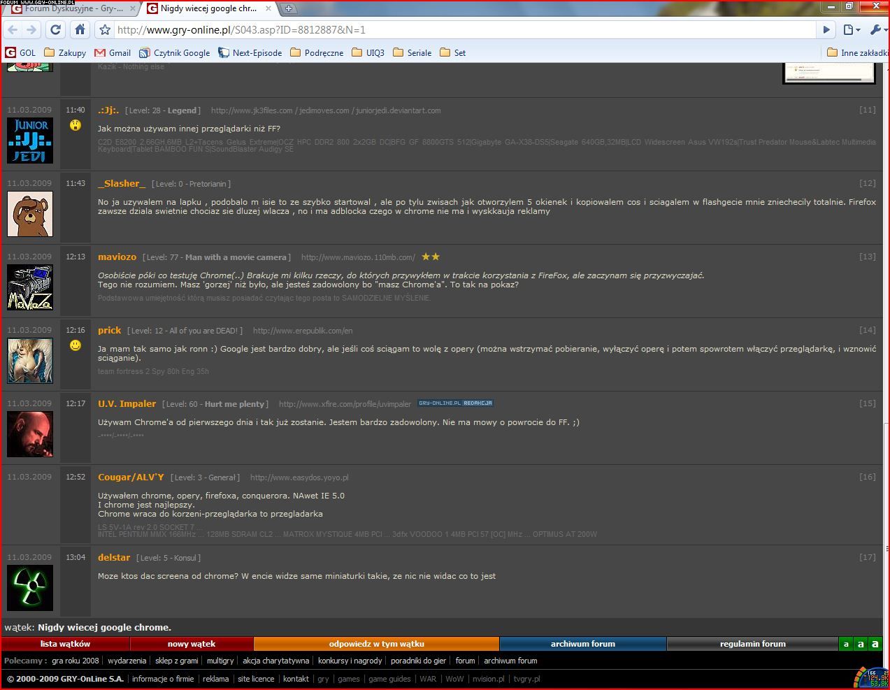 U mnie nie ma ww.wymienionych problemów. Akurat teraz korzystam z FF,lecz Chrome'a też mam zainstalowanego na lapku. Szybkość otwierania stron na GC miażdży! Muszę także zaznaczyć,że korzystam z sieci bezprzewodowej,więc internet naturalnie jest o wiele wolniejszy niż stacjonarny.