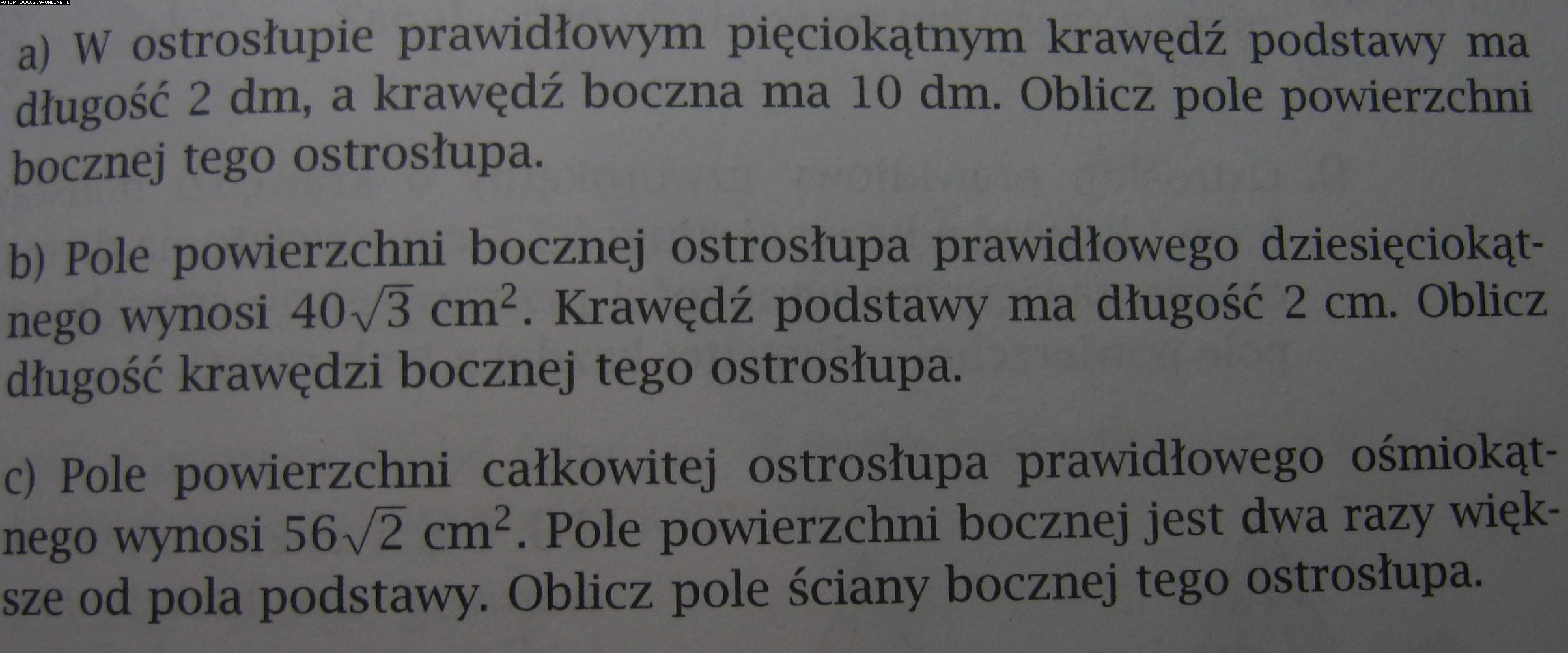 ramadan --- nie mieszaj chłopakowi:P wystarczy policzyć wysokość ściany bocznej z Tw. Pitagorasa (jedna przyprostokątna 1dm a przeciwprostokątna 10dm) a następnie policzyć pole takiej ściany i pomnożyć przez 5. W zadaniu nie pytają o pole podstawy.