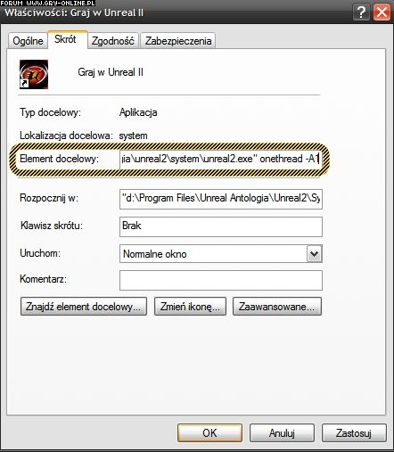 Ok... Uruchomiłem w trybie zgodności z Windows 98/Me ale jest problem bo mam Viste i nie mam zakładki "Skrót" i nie mogę nic dopisywać... Chyba że jest jakiś inny sposób... Czy można by zrobić nowy skrót do UT dodając na końcu " onethread -A1" ?