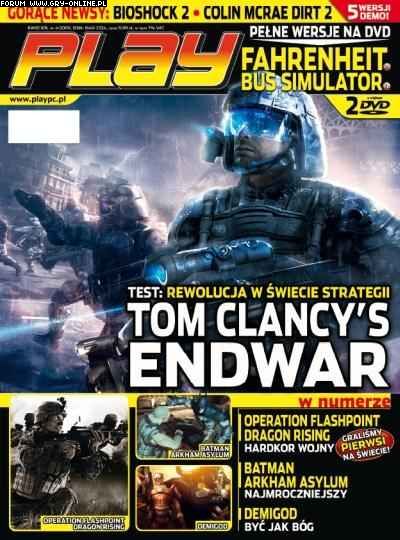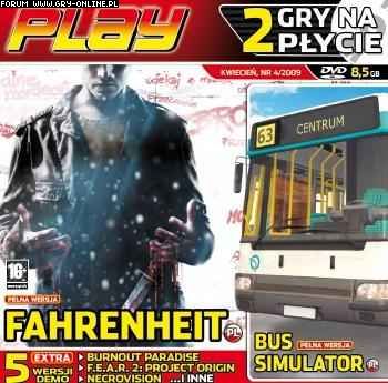 Pierwszy rzut oka na okładkę nowego PLAYA i już wiadomo, jakie mamy w tym miesiącu dania główne. Na płytce gra, która odmieniła oblicze przygodówek już na zawsze: Fahrenheit. Świetna historia, nowatorskie podejście do sposobu prezentowania fabuły (wcielamy się w kilka osób, czasem tropiąc samych siebie), filmowy klimat... W skrócie: w to trzeba zagrać. Druga pełna wersja to Bus Simulator. Mamy też pięć dużych demek, w tym F.E.A.R. 2: Project Origin, NecroVision i Burnout Paradise: The Ultimate Box!