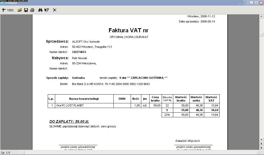 Ściągnij program fakturka, wpisz dane jakiejś firmy sprzedającej gry (znajdziesz je na stronach www), date zakupu gry na rok wstecz, swoje dane i gotowe.