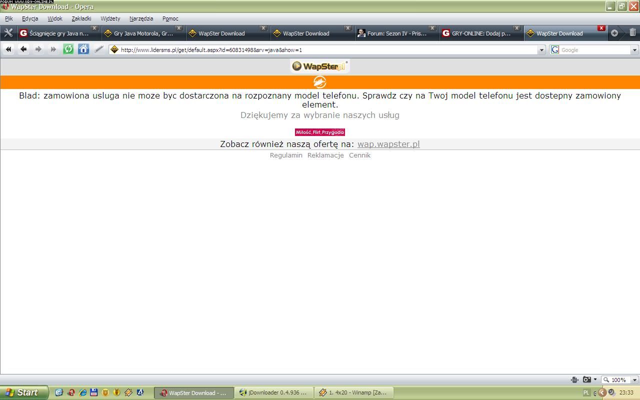 Musisz tez wiedziec, ze ci od gier java czesto zle podaja te telefony. Akurat wapster jest spoko, ale taka firma jak papla czy mobila powinna dawno upasc, bo kantują niemiłosiernie. Moim zdaniem masz zle skonfigurowany wap/gprs i dlatego nie pobiera na telefon. Natomiast przez komputer nie dziala, ponieważ wykrywa Twój komputer i - nic dziwnego - nie zna takiego "telefonu" :).