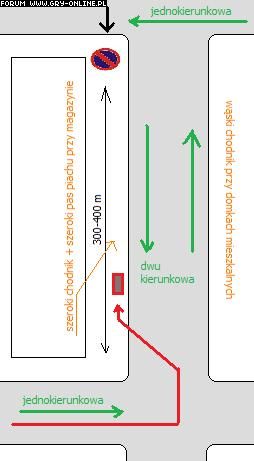 I jeszcze jedno pytanko aby nie wkopać się jeszcze bardziej :) Czy jadąc tak jak wskazuje czerwona strzałka czyli przejeżdżając z prawej strony jezdni na chodnik po lewej nie naruszyłem zadnego przepisu? Nie chcę aby walcząc o postój wydało się że popełniłem jeszcze inne wykroczenie :) Dodam iż to małe podmiejskie uliczki, nie było na nich żadnych linii pomiędzy pasami.
