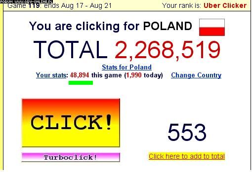 Mam do was prosbe. Znalazlem w necie fajna stronke, ktora polega na... klikaniu w okienko. Niby malo inteligentne, ale bardzo wciagajace. W tej "grze" znajdziemy nawet ranking swiatowy. Polska jest aktualnie 3 na swiecie pod wzgledem najwiekszej ilosci klikow.