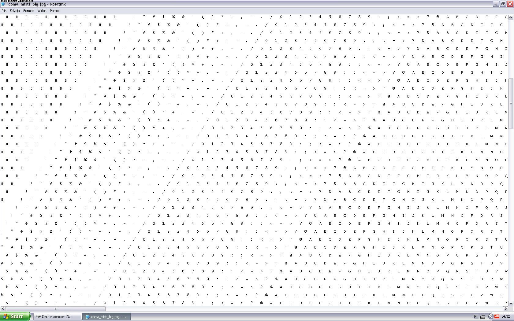 Wrzuciłem na niego przykładową grafikę, odpiąłem dysk, ponownie podpiąłem. Niestety pliki graficzne nie są już możliwe do użytku.. Otwarłem je przez notatnik, a moim oczom ukazał się dziwny ciąg znaków ------>