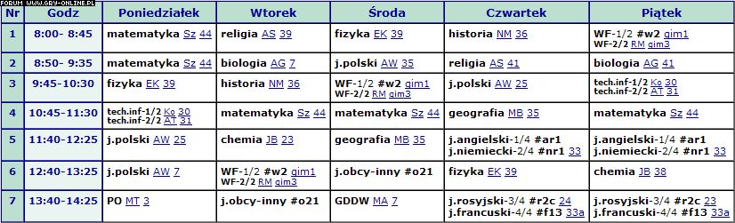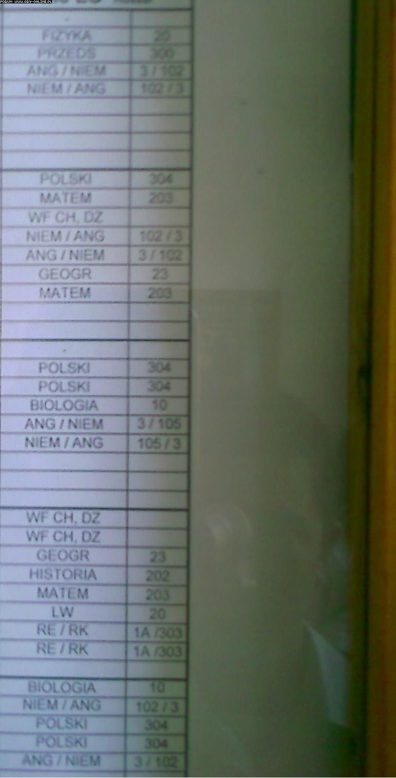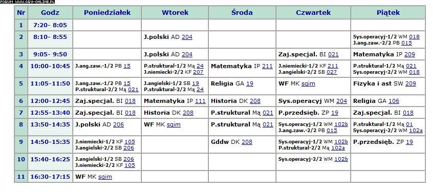 Ja też mam kijowo, codziennie 8:00-!4:25 i jakoś durnie są połączone lekcje, w ogóle jest gorszy niż w I-klasie, miałem te same godziny, ale lepiej rozłożone lekcje