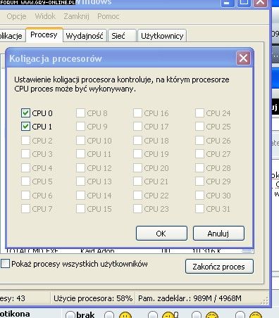 KaidAdon --> wiesz, na tym screenie co go podales, to koligacje masz ustawiona na 2 rdzenie. Odznacz jedna z tych opcji, tak zeby zostalo na przyklad CPU0 jako zaznaczone i zobacz wtedy co bedzie sie dziac.