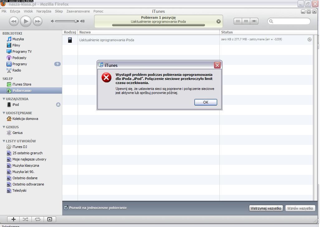 Kliknałem przywróć w iTunes i po pobraniu oprogramowania wyskakuje taki błąd jak na screenie, próbowałem kilka razy, pobiera sie cały i potem wyskakuje błąd.