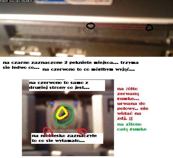 boze... chciale zrobic edit ale czas uplynol... dolny obraze to wyrwany przycisk... przycisk mam, tylko zawias poszedl i taka mała gumeczka sie porwała... a to drugie to jakieś gówno :P mi chodzi o kawałek obudowy nad Szczeliną expresc Card ... ten pasek co wylatuje jak zapałka jst... sorki za słabą jakość... komurką robiłm..;]