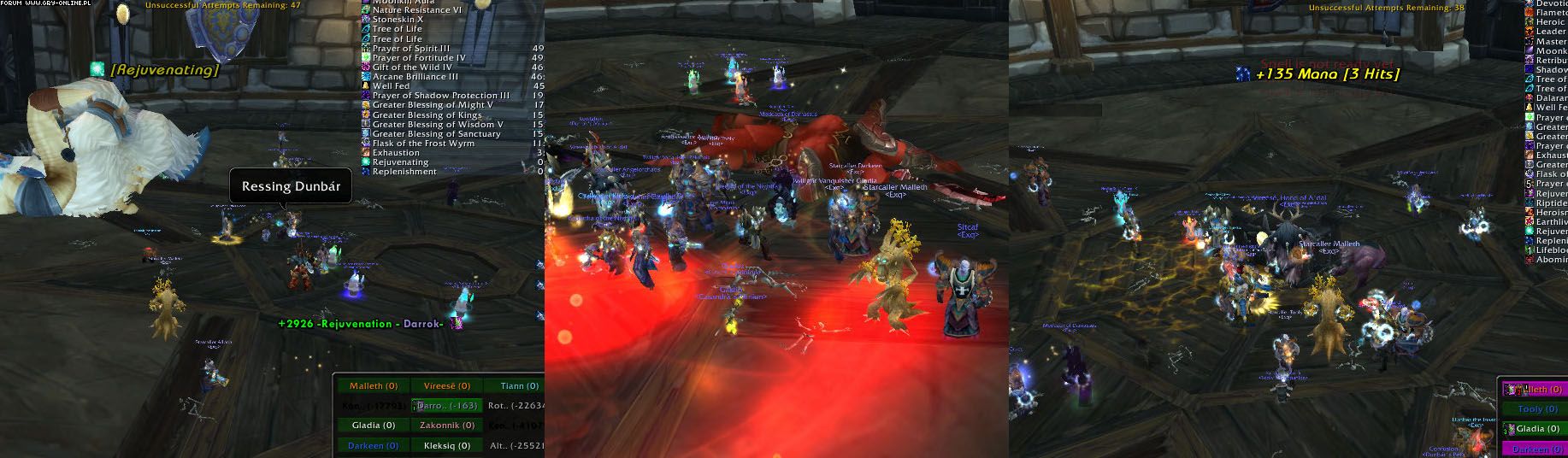 5 healerow - po 2 na boki i jeden na srodku. Boss na schodach, ranged rozstawieni w maksymalnym mozliwym spreadzie. Rogale totuja 2 moonkinow i fokuja addy po czym druidzi je odpychaja tajfunem gdy juz sa blisko, ele shaman pomaga thunderczymstam. Po za tym to tak jak Hell wspomnial czysty wyscig dpsu i wylapywacz playerow-turretow, ktorzy stoja i dpsuja ile wlezie tankujac przy tym addy. W killowym traju pierwszy mark wskoczyl nam na 65% bossa, na enragu byly bodajze 3 a na samym koncu 6. Heroism kolo 20%.