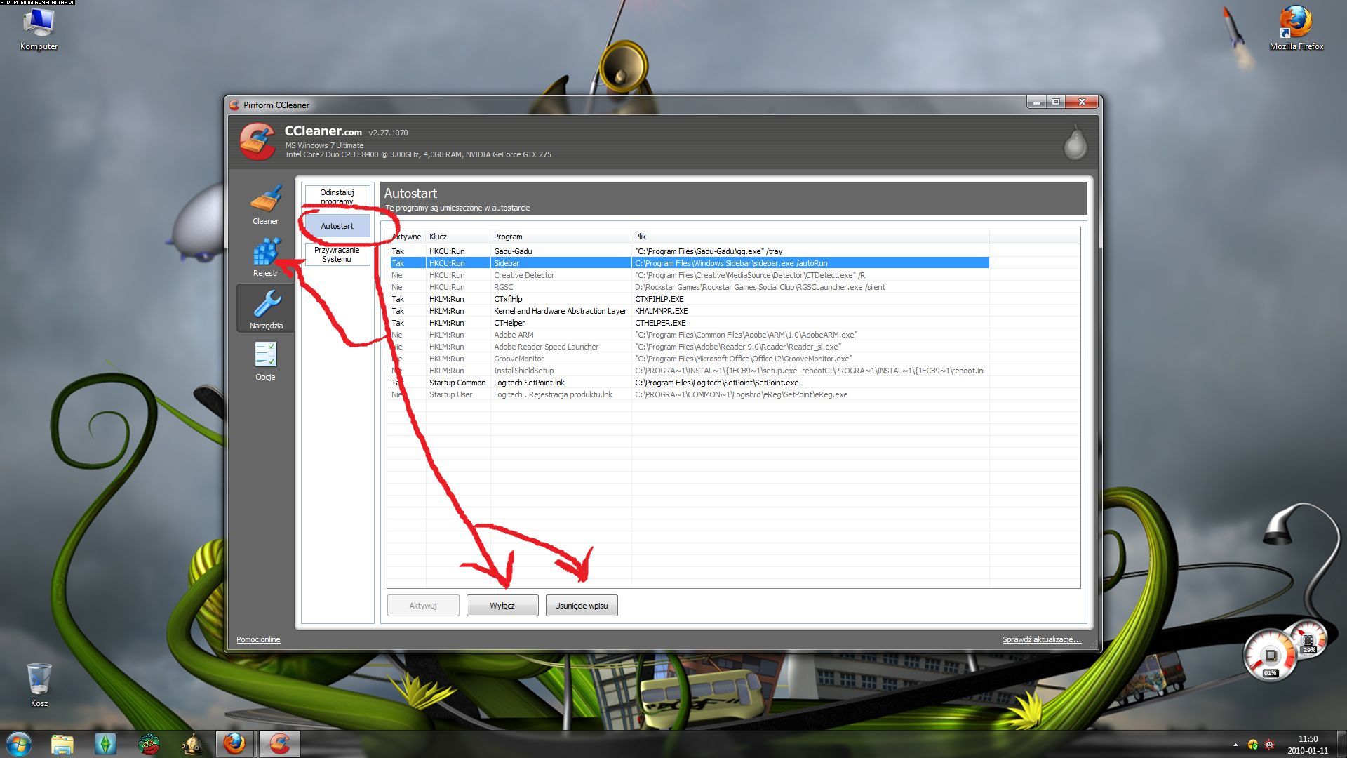 Mam taki problem : jak włączam komputer to zawsze muszę czekać z 5 minut żeby mi się włączyły programy np. Ares , GG , Ipla , i kilka innych programów a nastepnie pokazują mi sie w pasku na dole obok zegara na monitorze nie wiem jak sie to nazywa :P raczej wiecie o co chodzi .