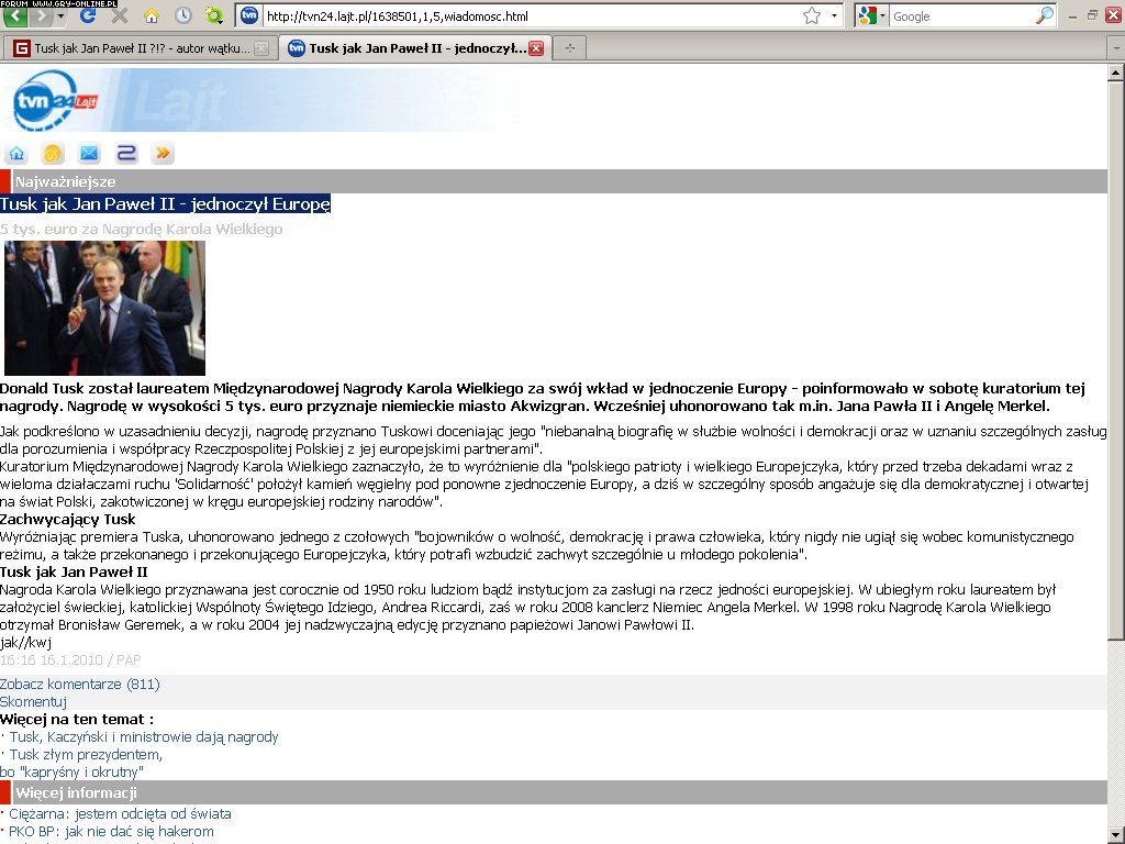 wracając do kwestii trafności tytułu - "Tusk jak Jan Paweł II - jednoczył Europę" by TVN, nawet gdyby nie był obraźliwy, to jest absurdalny - w zasadzie Traktat Lizboński negocjował i podpisał Nasz Prezydent Lech Kaczyński, a w 2003r. traktat o wejściu do UE podpisywała ekipa Kwaśniewskiego.