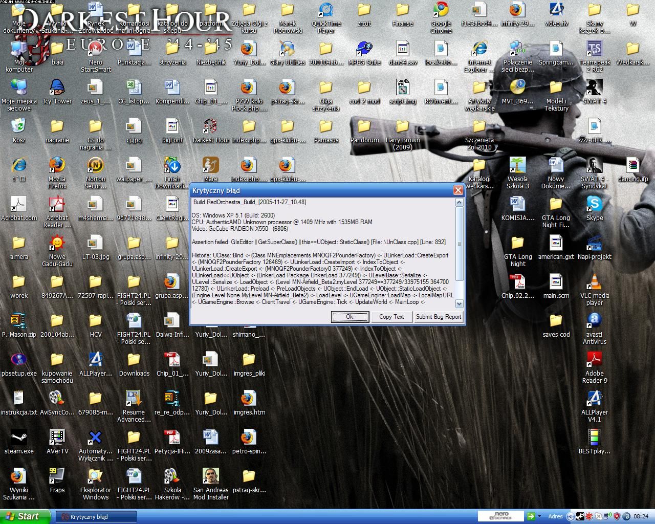Gdy chcę wejść na jakąś mapę wyrzuca mnie Pulpitu. Jest to o tyle dziwne, że z Red Orchestrą i modem do niej (podobnym do Mare Nostrum, tylko że dziejącym się we Francji) Darkest Hour nie było takiego problemu.